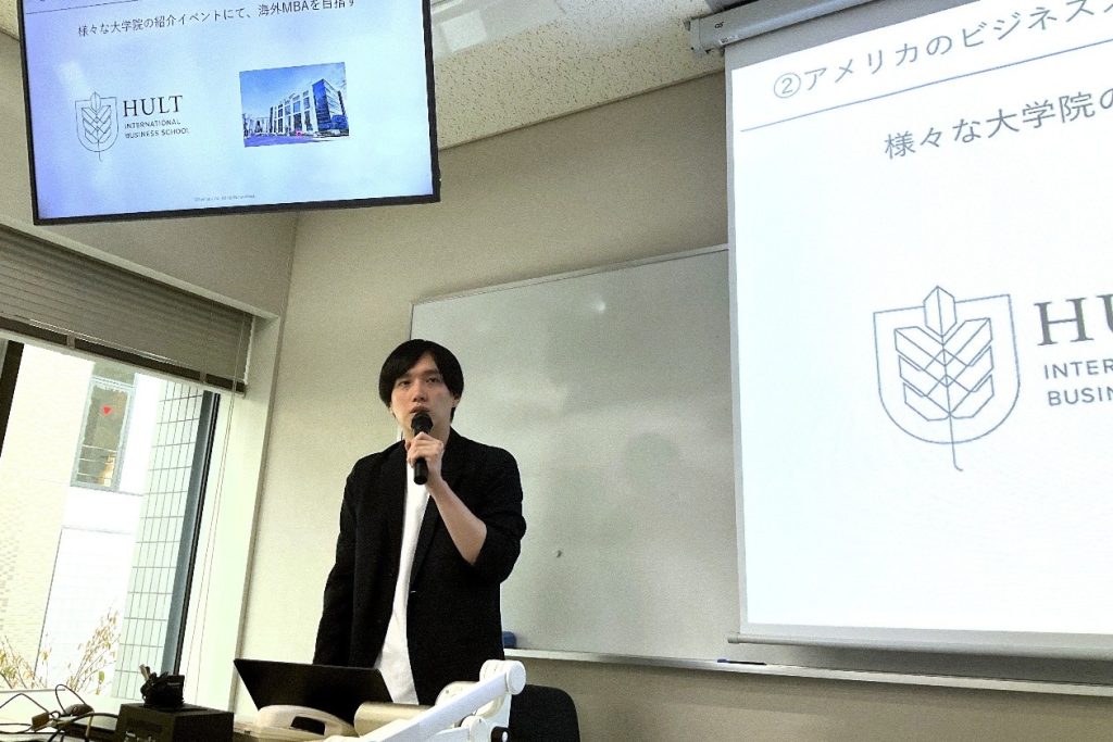 講師は当社代表の小林が務め、大学時代のゼミ活動で培った「企業支援への関心」を起点に、商工会議所でのキャリア・海外MBAへの挑戦・人材企業での執行役員就任・副業経験、そして起業へ至るまでのリアルな歩みなどを学生に共有。